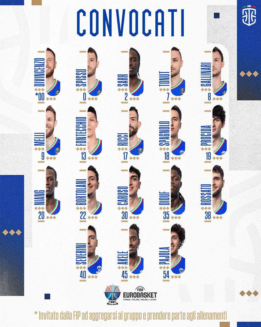 18人大名单包括:唐特-迪温琴佐(森林狼)、达尼罗-加利纳里、西蒙尼-冯泰奇奥(热火)、萨利乌-尼昂(骑士,今年58号秀)、尼科洛-梅利、马可-斯皮苏