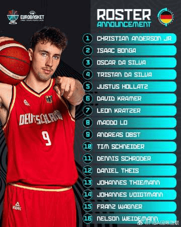 配文如下:德国男篮公布备战2025FIBA欧洲杯的16人集训名单。施罗德、F·瓦格纳领衔;泰斯、奥布斯特等世界杯冠军队成员在列,U19明星球员安德森升入成年队。本届赛事德国队与立陶宛队、黑山队、芬兰队、英国队、瑞典队同组,你认为他们能取得怎样的成绩?