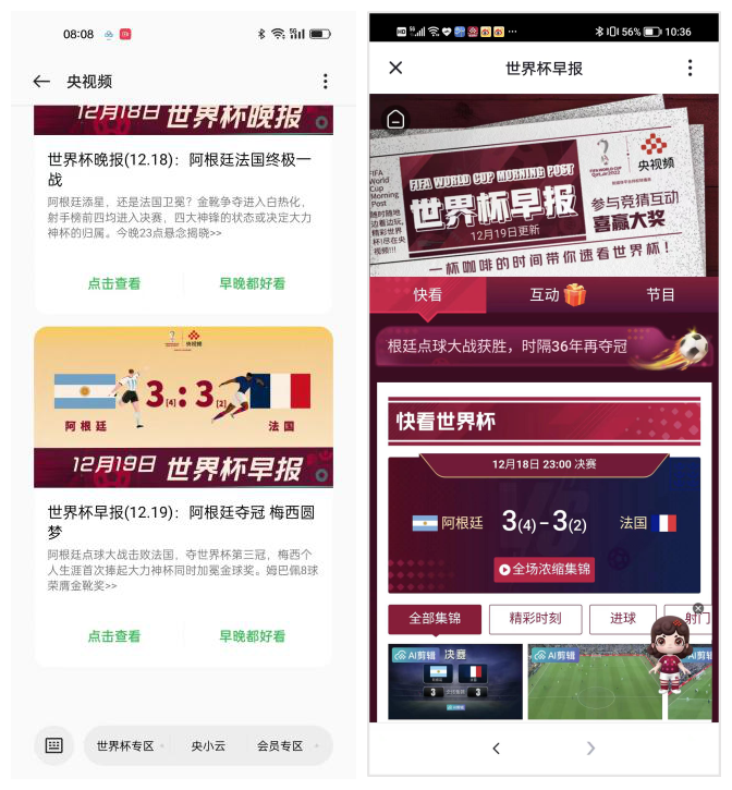 除了5G消息之外,央视频还同步通过央视频App官方PUSH、官方微博进行内容信息的全量推送。微博话题#来央视频看世界杯早报#、#来央视频看世界杯晚报#累计阅读次数1076.4万次。“世界杯早晚报”精准覆盖全国超6000万用户,累计触达用户超5亿次。
