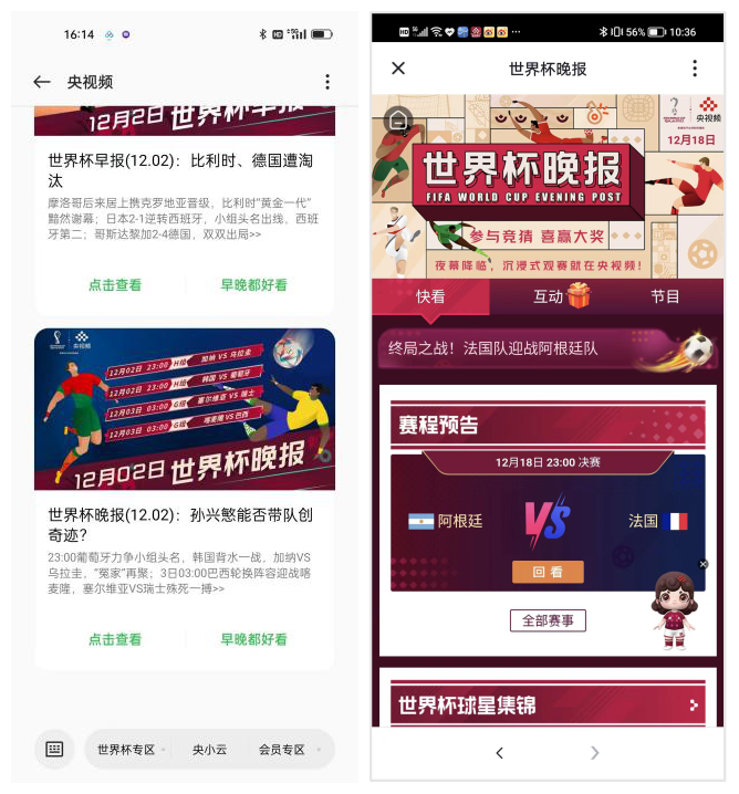 这一产品的“神奇”之处在于,收到“世界杯早晚报”的用户无须注册或关注好友,只需要连接运营商网络后打开手机自带的“信息”应用,即可查看相关内容产品并实现信息交互。利用这一技术创新,央视频开启与赛程同步的权威、前沿、全面的赛事资讯分发和解读,“孙兴慜能否带队创奇迹”“摩洛哥、葡萄牙晋级8强”“阿根廷夺冠 梅西圆梦”等消息被即时推送至用户手机,为用户获知赛事信息提供了极大便利。