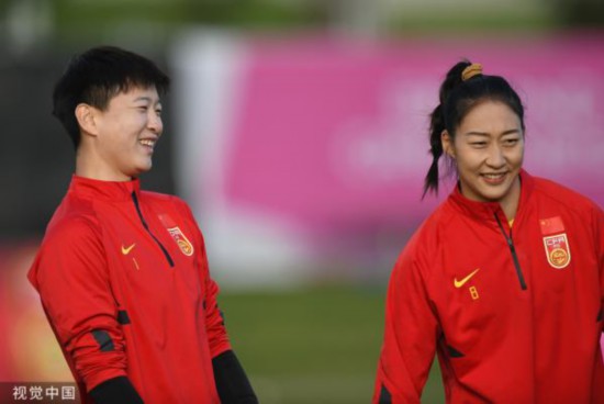 正式训练前,所有队员径直来到看台下方,姑娘们挥着手向球迷们问好,看台上响起热烈掌声:“中国女足加油!”“中国女足最棒!”